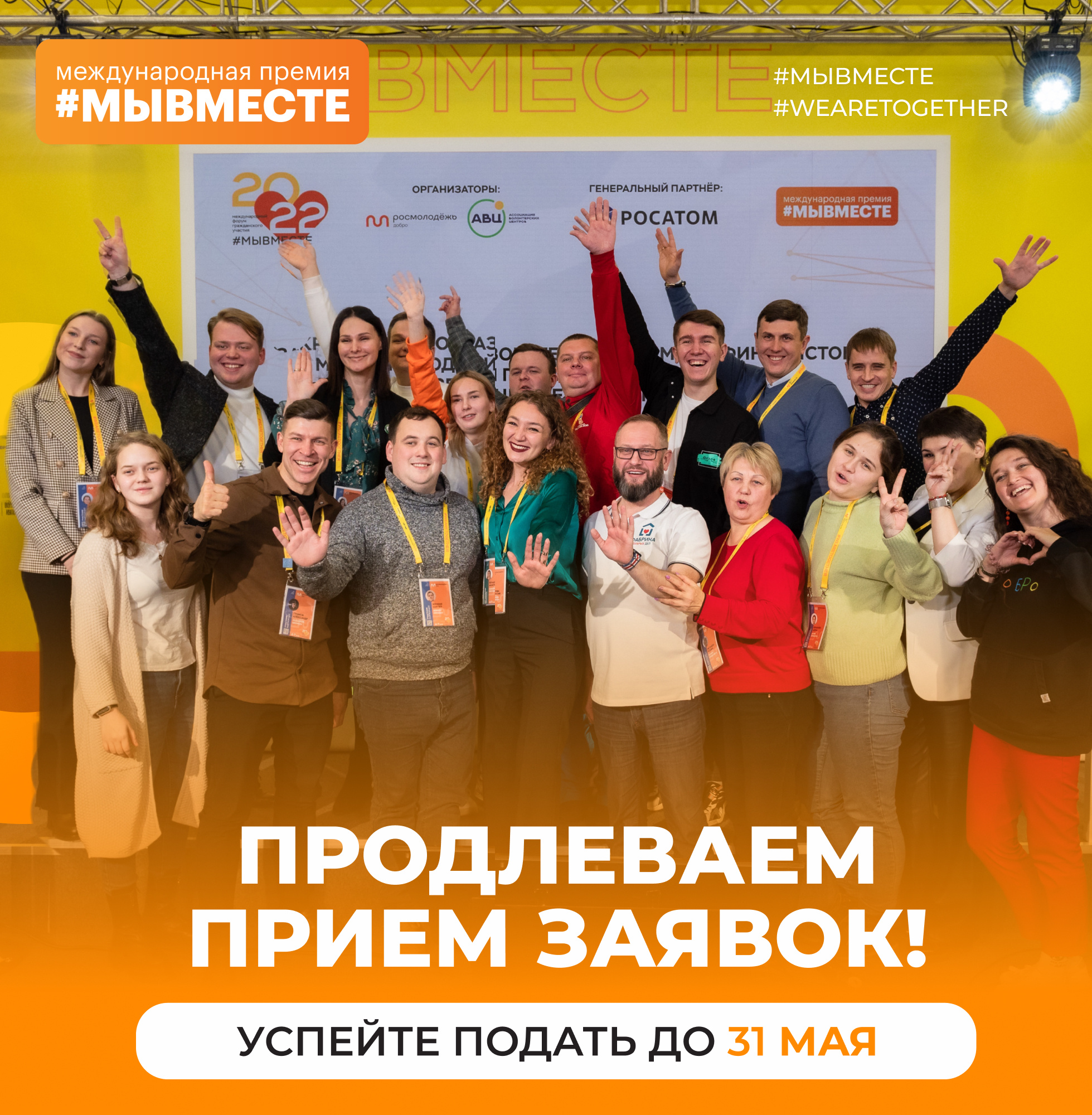 С учетом большого интереса к номинациям и возможностям поддержки проектов участников Премии #МЫВМЕСТЕ срок заявочной кампании 2023 года продлен до 31 маяО ПРЕМИИ